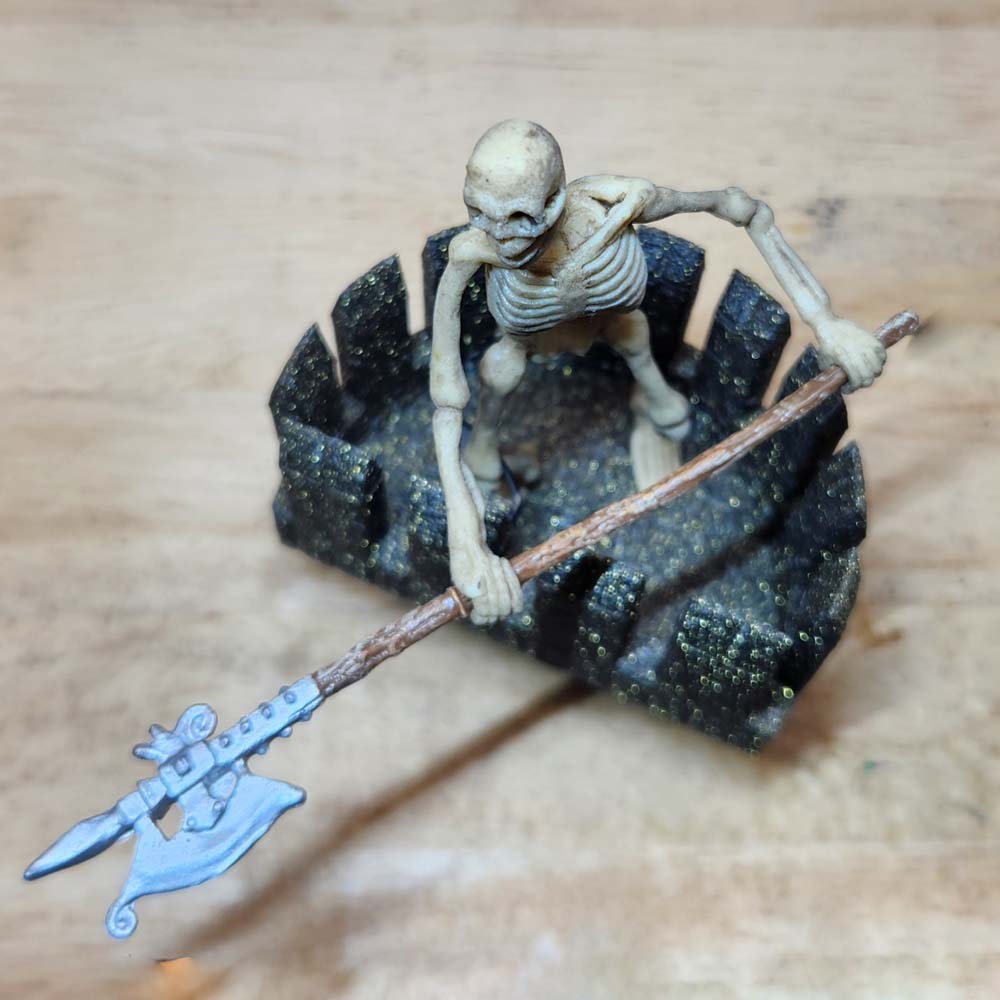 The castle parapet is printed in a black filament with gold sparkle, adding texture and matching the game colors (and the LE trim’s powdercoat). The walls, spires, and floor of the parapet are 3D textured to add to their realistic look. The wall below the parapet also includes a thin window typical of castle towers. The pre-manufactured skeleton stands poised to defend the fiery gate of the Black Castle!