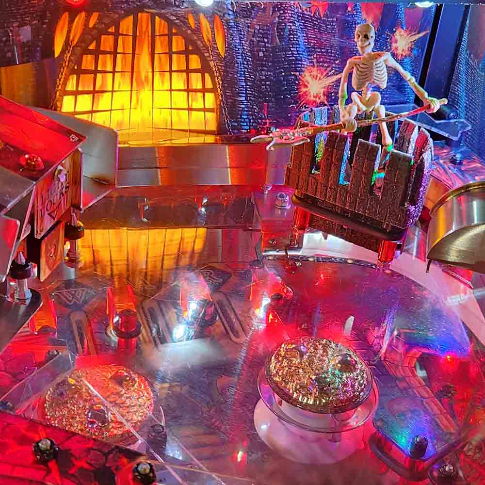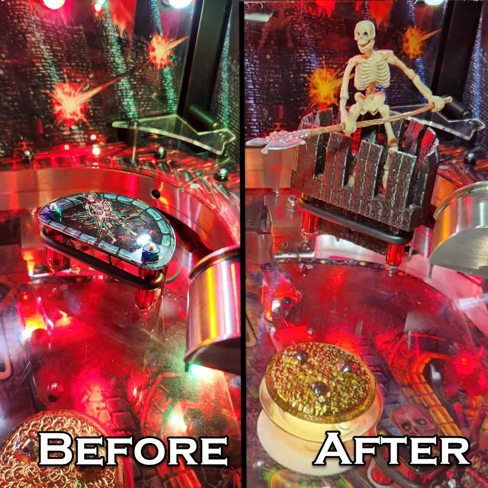 On the upper playfield (Prem/LE only) of Black Knight: Sword of Rage, a raised plastic depicts a parapet with a skeleton archer. It’s small, flat, not very noticeable, and leaves the area feeling empty — so Rocket City Pinball;s Castle Parapet mod can bring it to life!
