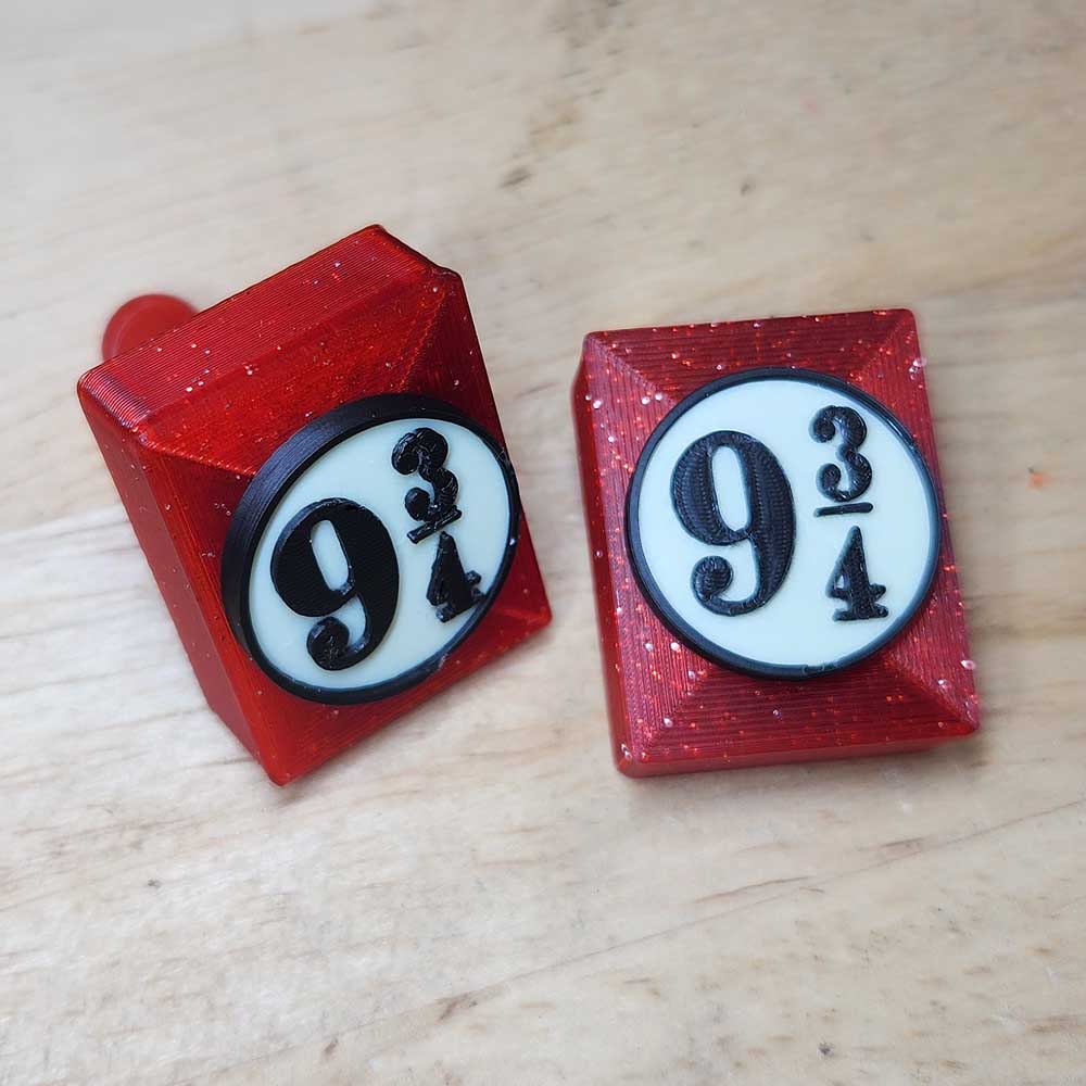 These 3D coin reject buttons are adorned with a 3D sign for Platform 9-3/4, with an off-white background and black border & text. Default base color is translucent red with sparkle, to replicate the original sign design but also give it that magical touch. Other base colors available too.